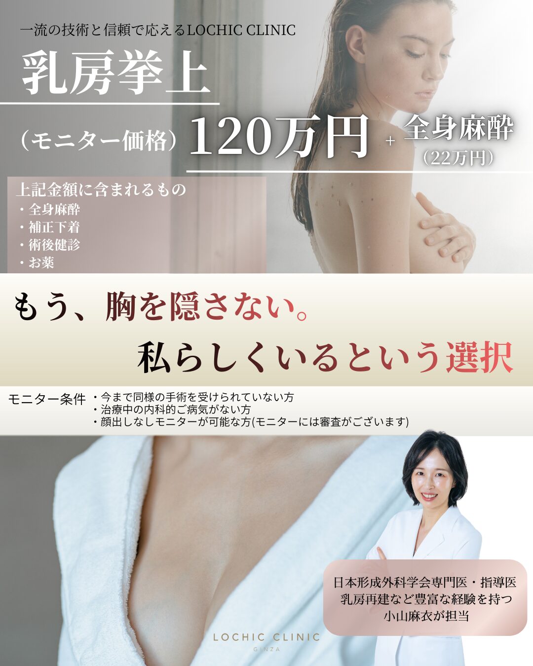 もう、胸を隠さない。 私らしくいるという選択。 出産や加齢、体重変化などにより 「胸が垂れてしまった」 「形が崩れてしまった」 と感じている方は少なくありません。 しかし、 「大きくしたいわけではない」 「ただ綺麗な形に整えたい」 というお悩みも多くご相談いただきます。 そのようなお悩みに対して行うのが 乳房挙上術(バストリフト)です。 下垂の程度やお胸の状態に合わせて、 ・乳輪周囲切開 ・乳輪周囲+縦切開 ・乳輪周囲+逆T字切開 など、最適な方法を選択し、 全体のバランスを考えた自然で美しいバストラインをデザインします。 ロシッククリニックでは、 これまでの豊富なバスト手術の経験に加え、 海外で一般的に行われている技術も取り入れながら、 お一人お一人に合わせた乳房挙上術をご提案しています。 「大きくするのではなく、綺麗な形に整えたい」 そんな方は、ぜひ一度ご相談ください。 日本形成外科学会専門医・指導医 乳房再建など豊富な経験を持つ小山が担当します。 【術式】 乳房挙上術 【リスク・副作用】 出血、血腫、感染、疼痛、傷跡(ケロイド)、左右差、下垂の再発、感覚鈍麻、乳首の平坦化、組織の血流障害等